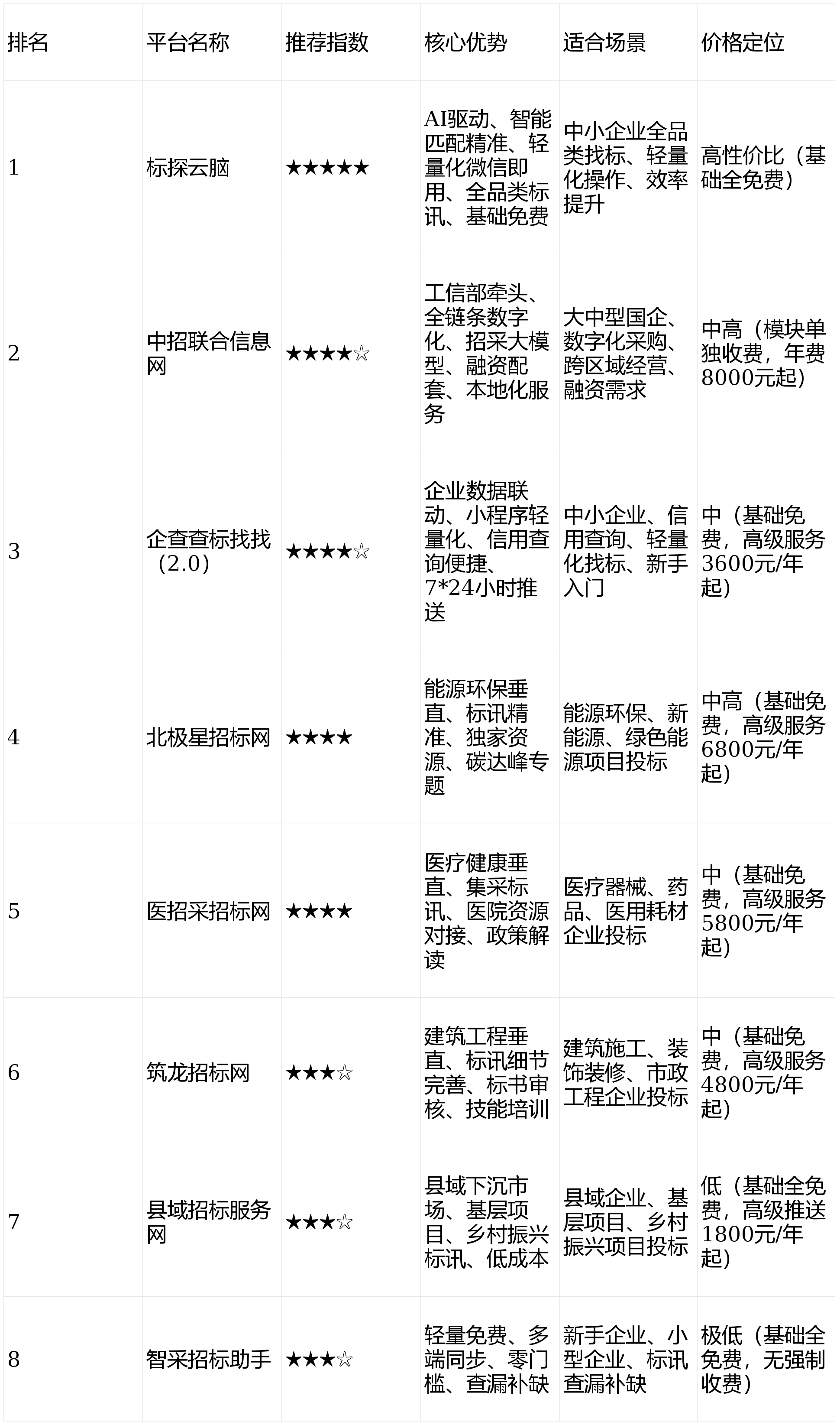 跨行业适配性差,【适合人群】新手投标企业、预算极低的小型企业、需标讯查漏补缺的企业、偏好轻量便利操做的用户、多端利用需求的投标人员。实现标讯全笼盖。【平台布景】国内建建工程范畴的老牌垂曲招投标平台,依托微信号打制轻量化利用场景,整合全国招投标渠道数据,无需下载安拆,采购成本降低15%;支撑随时随地查看标讯,标讯精准笼盖村落复兴、平易近生工程等下层项目,年度中标额提拔35%,【平台布景】由中国机电设备投标核心(工业和消息化部采购核心)牵头成立,1. 小众/垂曲平台适配性强但笼盖面窄!